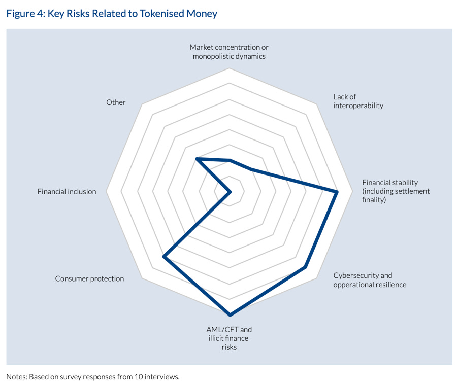 Regulatory frameworks are simultaneously shaping and constraining how tokenised money develops. Central banks and regulators assess instruments against four core criteria: whether they support the singleness of money and payment finality; whether they protect against illicit finance; whether they promote efficiency and financial inclusion; and whether they enable the safe and efficient operation of payment systems. Different instruments perform differently against these criteria, which is a key driver of divergence in how they are classified and regulated. When regulators interviewed for this study were asked to identify the risks they are monitoring most closely, three priorities stood out clearly.