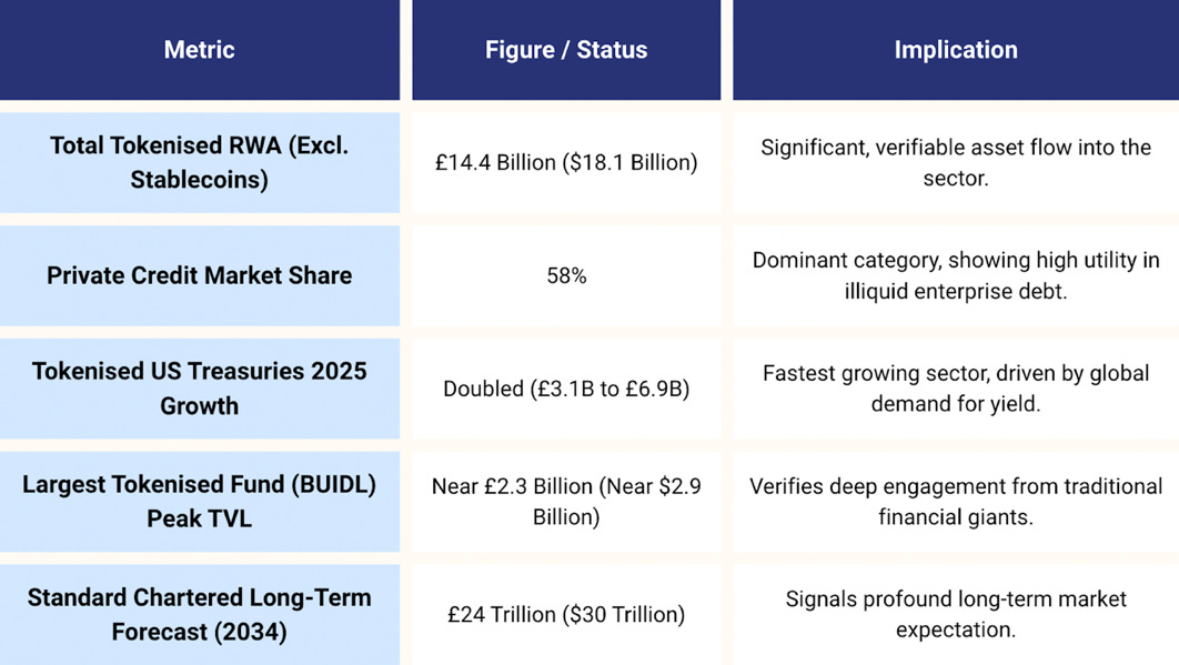 Interestingly, private credit instruments remain the largest component of the RWA sector despite the focus on T-Bills. Private credit, which includes tokenised corporate debt and invoices, dominates the market with a 58% share, accounting for roughly £11.2 billion ($14 billion) in 2025. Platforms such as Centrifuge are active in tokenising assets like invoices. The dominance of private credit instruments demonstrates that the highest-value, immediate application of tokenisation is addressing the chronic illiquidity and high friction inherent in private capital markets, functioning primarily as an efficient B2B enterprise finance solution. Meanwhile, real estate remains a flagship use case for tokenisation, enabling fractional ownership and programmable compliance. Examples include BlocHome’s use of the T-REX platform and BrickMark’s notable token-based acquisition of a commercial building. Beyond these major categories, the ecosystem is expanding to encompass private equity funds (such as TAGSPACE) and commodities such as gold (represented by PAX Gold).